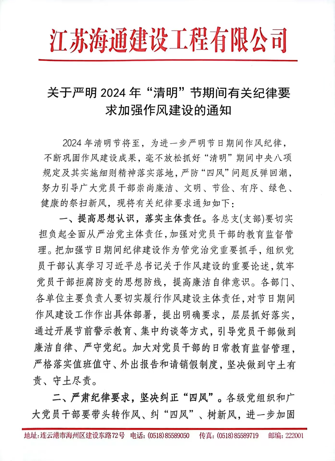 2024年清明节将至,为进一步严明工作纪律,严守廉洁防线,防止节日期间滋生“四风”问题,江苏海建公司纪委发出通知,提醒广大党员干部严格遵守中央八项规定精神,倡导廉洁、安全、文明、节俭、绿色的祭扫新风尚。