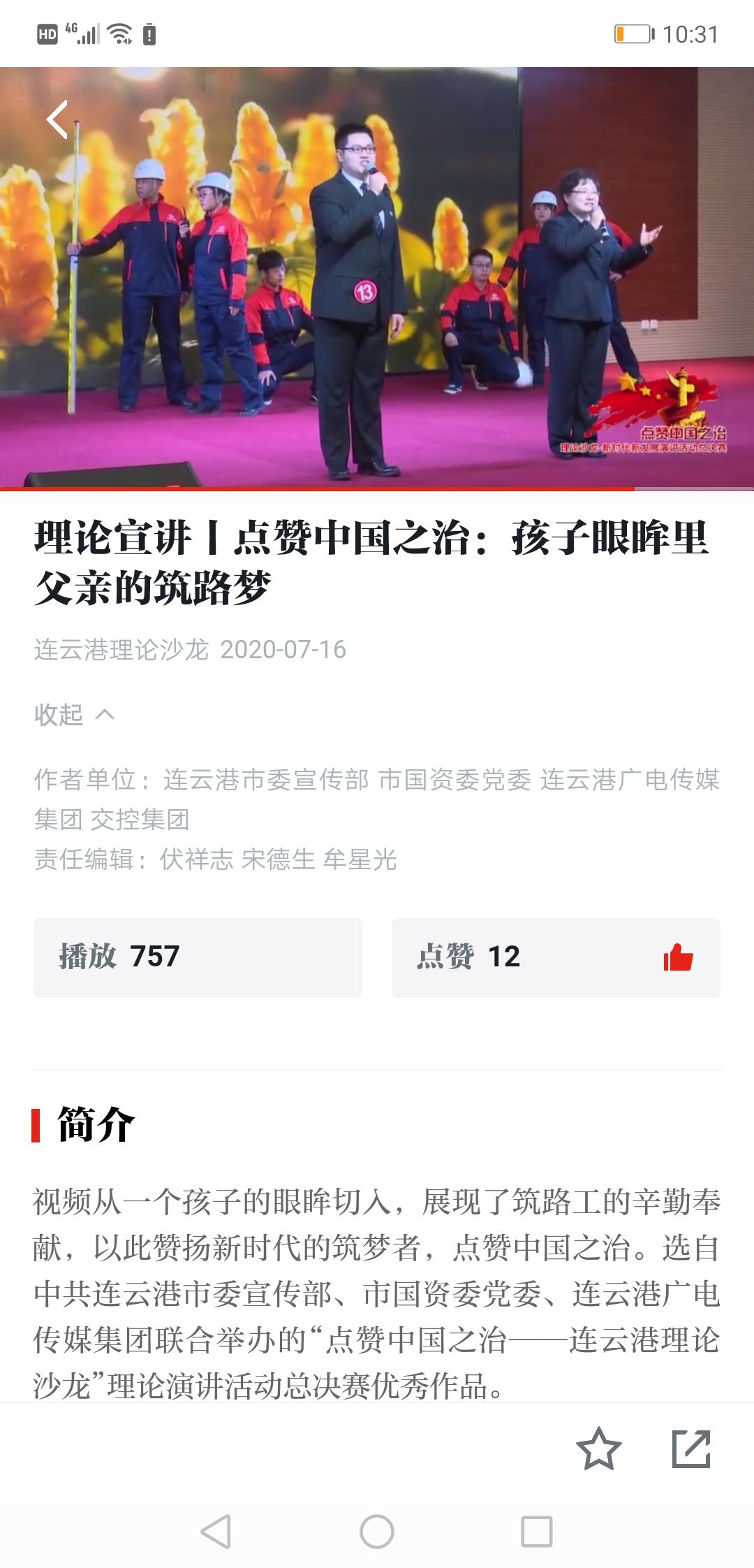 该视频从一个孩子的眼眸切入,展现了交控米兰app最新版下载,米兰(中国)筑路工的辛勤劳动和无私奉献的精神,以此赞扬了新时代的筑梦者,点赞了中国之治。它是选自连云港市委宣传部、连云港市国资委党委、连云港广电传媒米兰app最新版下载,米兰(中国)联合举办的“点赞了中国之治——连云港理论沙龙”理论演讲活动总决赛的优秀作品。