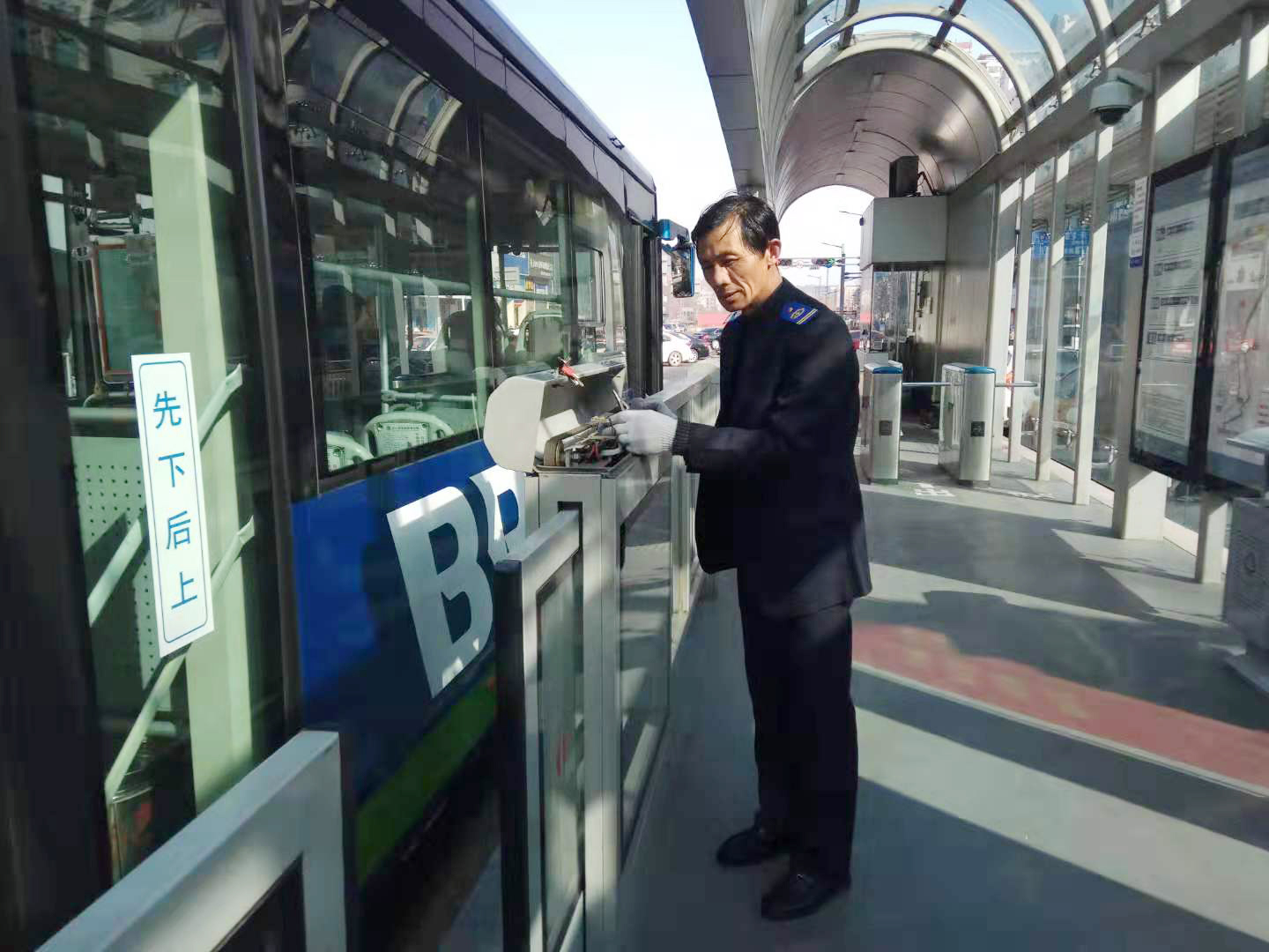 六年多前BRT建成开通时,尹德军师傅和大家一样,对BRT站台的一切都是从零开始,但是现在,尹师傅却是整个公司里最熟悉BRT站台设备的人,也是站务员最熟悉的亲人。站台安全门打不开,站务员打电话找尹师傅;设备间排风扇不工作了,站务员找尹师傅;售票房的灯不亮、桌子、椅子坏了,站务员都找尹师傅。站务员的工作时间是早上五点半到晚上九点,站务员们有早、晚班的区别,可是站台维修员尹德军师傅是没有上下午班之分的,不管站务员是早上五点多打电话找他,还是晚上八九点时找他,接到电话的尹师傅总是第一时间内赶到站台,帮助站务员解决难题。在BRT成立的七年的时间里,尹德军师傅他自己也不知道有多少个清晨在睡梦中被电话铃声叫醒、多少个晚上在一家团聚吃晚餐的时候放下碗筷,赶去站台抢修设备。