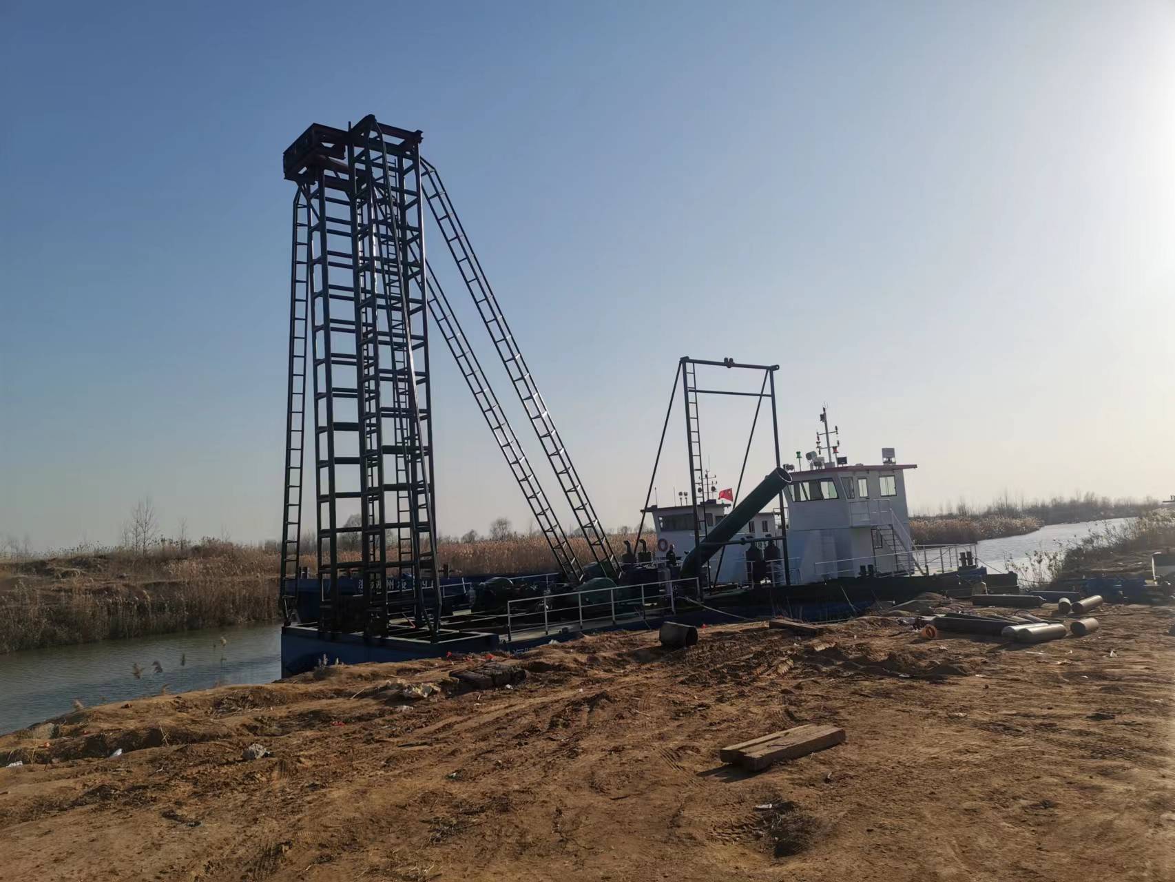近日,在江苏海建公司石梁河生产基地现场,采洗砂项目海陵湖采003号射吸船到达东方红码头后,迅速开始进行船舶拼装作业。