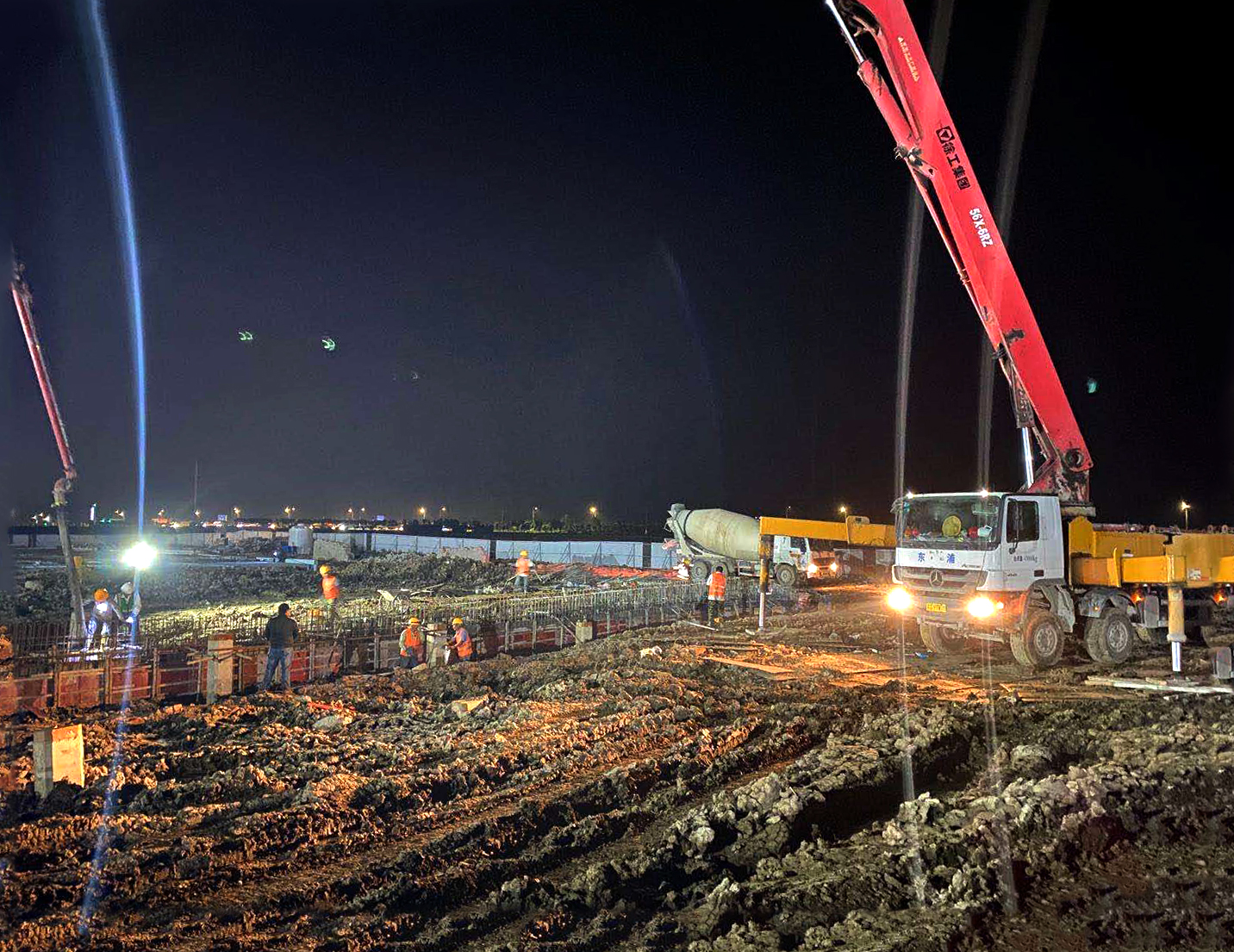 目前,现场日均施工人员数量160人、7台挖机、2台铲车,分块平行作业,工作重心在于车间基础垫层施工。为确保按时完成工程节点,施工单位在车间周边布置四盏照明灯,组织部分班组夜间施工,夜间工地灯火通明犹如白昼,砌筑、运料、浇筑、开挖等各项工作有序展开。做好后勤保障工作,为夜间施工的工人提供夜宵、驱蚊水、药品、雨衣等,保证工人师傅能够持续健康作战。为应对下雨天气,现场配置各类水泵10余台,确保当日下雨当日排清;为施工人员配置雨衣、雨鞋,做到部分工作雨天不停工。项目指挥部管理人员、监理放弃节假日休息时间,挑灯夜战,对现场质量、安全进行全天候监督管理。项目参建各方以“白天正常干、夜间挑灯干,雨天不停干、节假日继续干”的决心,力争7月底完成厂房基础垫层施工,为8月份钢构吊装奠定基础。